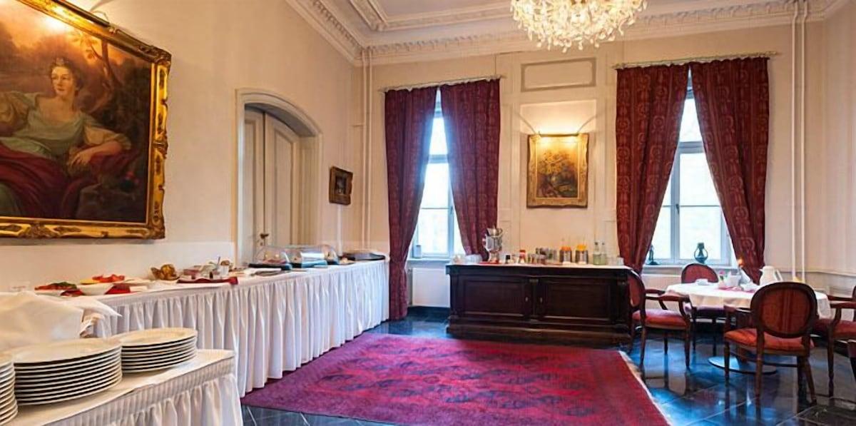 Die 14 charmanten Nichtraucherzimmer verbinden historischen Charakter mit modernem Komfort. Alle Zimmer sind mit Dusche oder Badewanne, WC, LED-TV, Telefon, Radiowecker und Föhn ausgestattet. Einige Zimmer verfügen über romantische Himmelbetten und einen herrlichen Blick in den alten Schlosspark. Für besondere Anlässe steht eine stilvolle Suite im Obergeschoss bereit, ausgestattet mit Himmelbett, Whirlpool und seitlichem Ausblick auf den Park und den Wasserturm mit Storchennest.